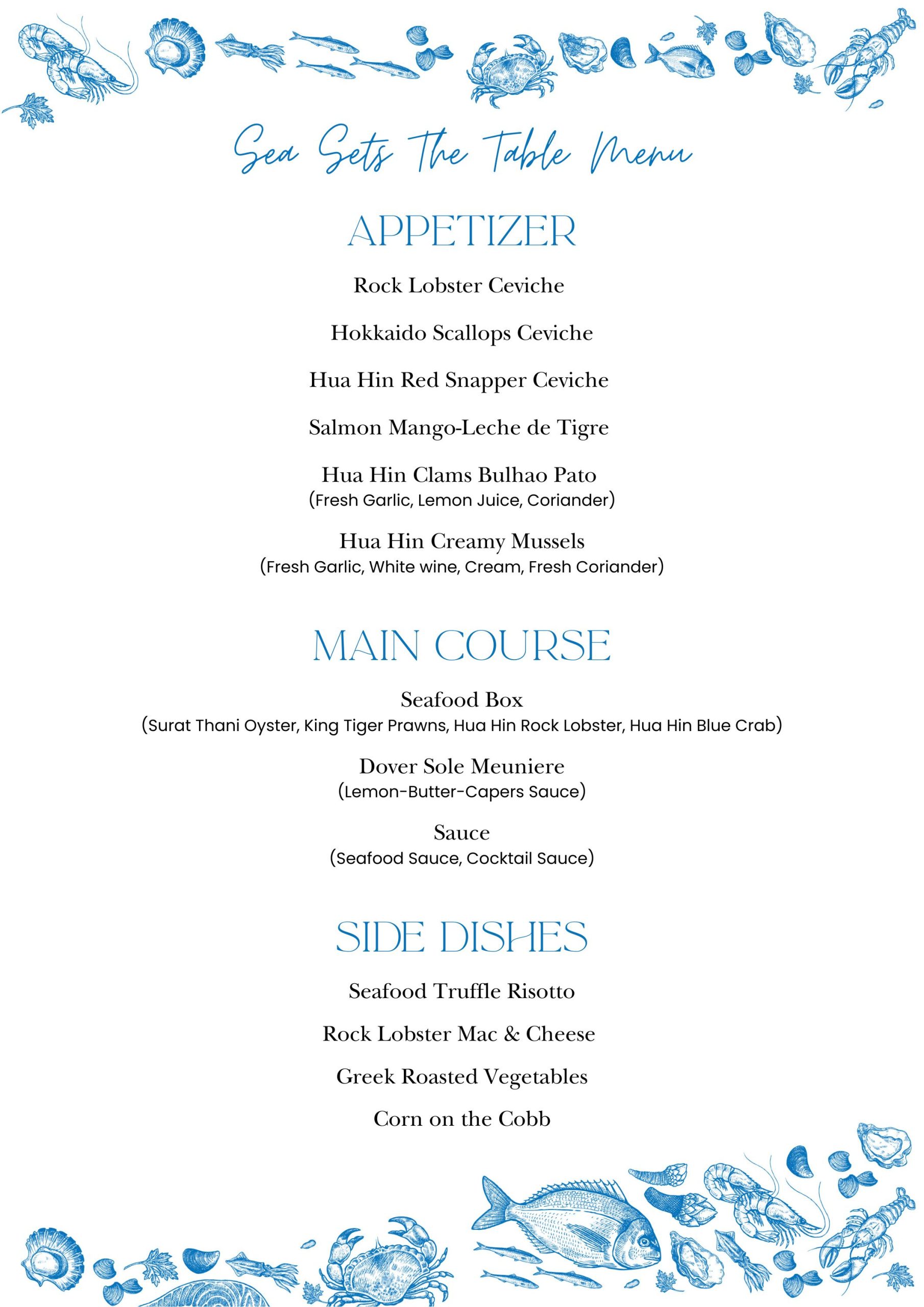 Start with flavorful bites—crisp, creative appetisers you can enjoy as much as you like. Help yourself to vibrant sides throughout the night, thoughtfully crafted to complement the star of the show: the freshest catch of the day, served in a chilled or cooked seafood treasure box.