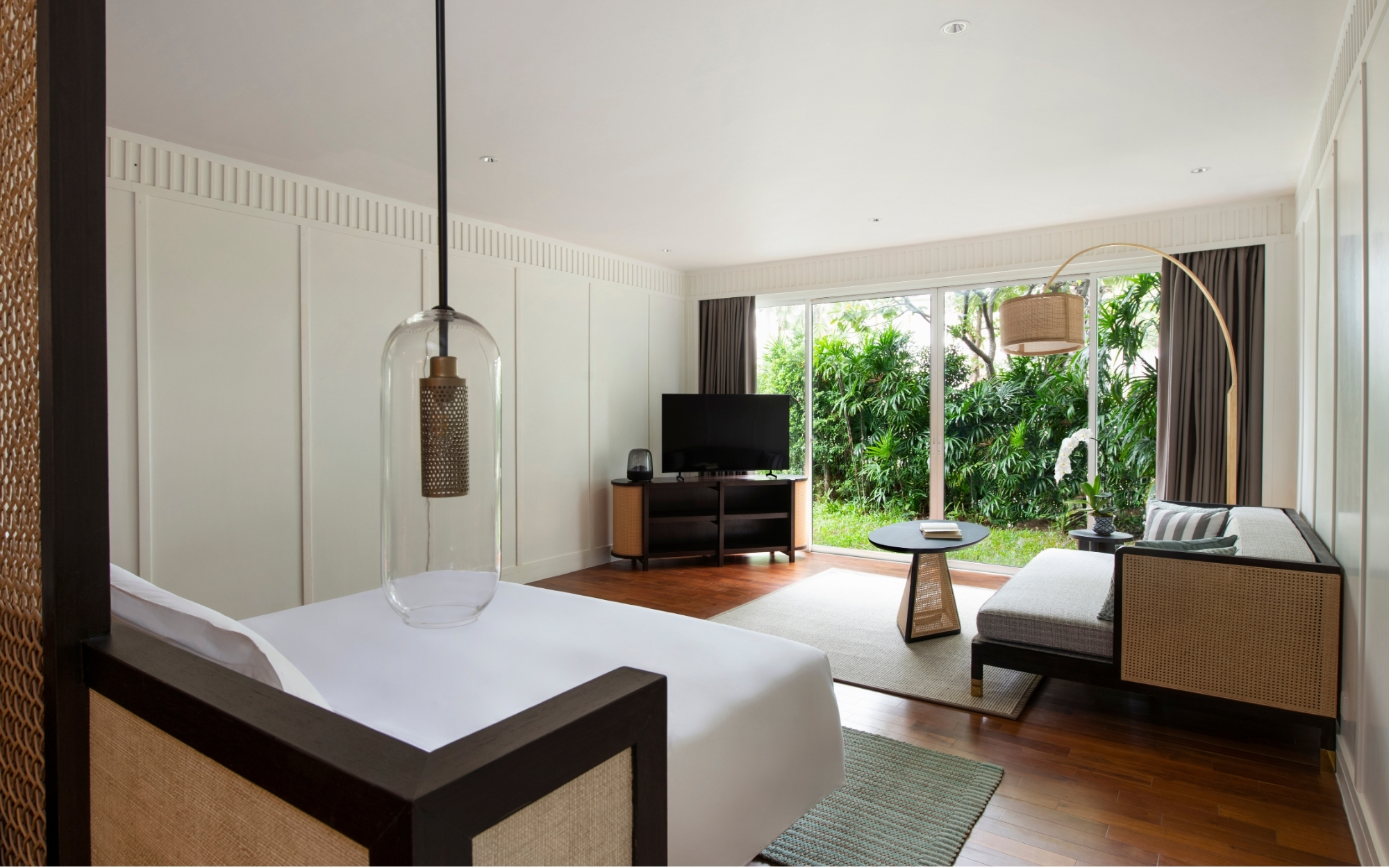 พื้นที่ 44-53 ตร.ม. ห้องพักฝั่ง Beach Wing มีระเบียงขนาดใหญ่ ชุดเครื่องนอนหรูหรา และห้องน้ำกว้างขวาง วิวสวน