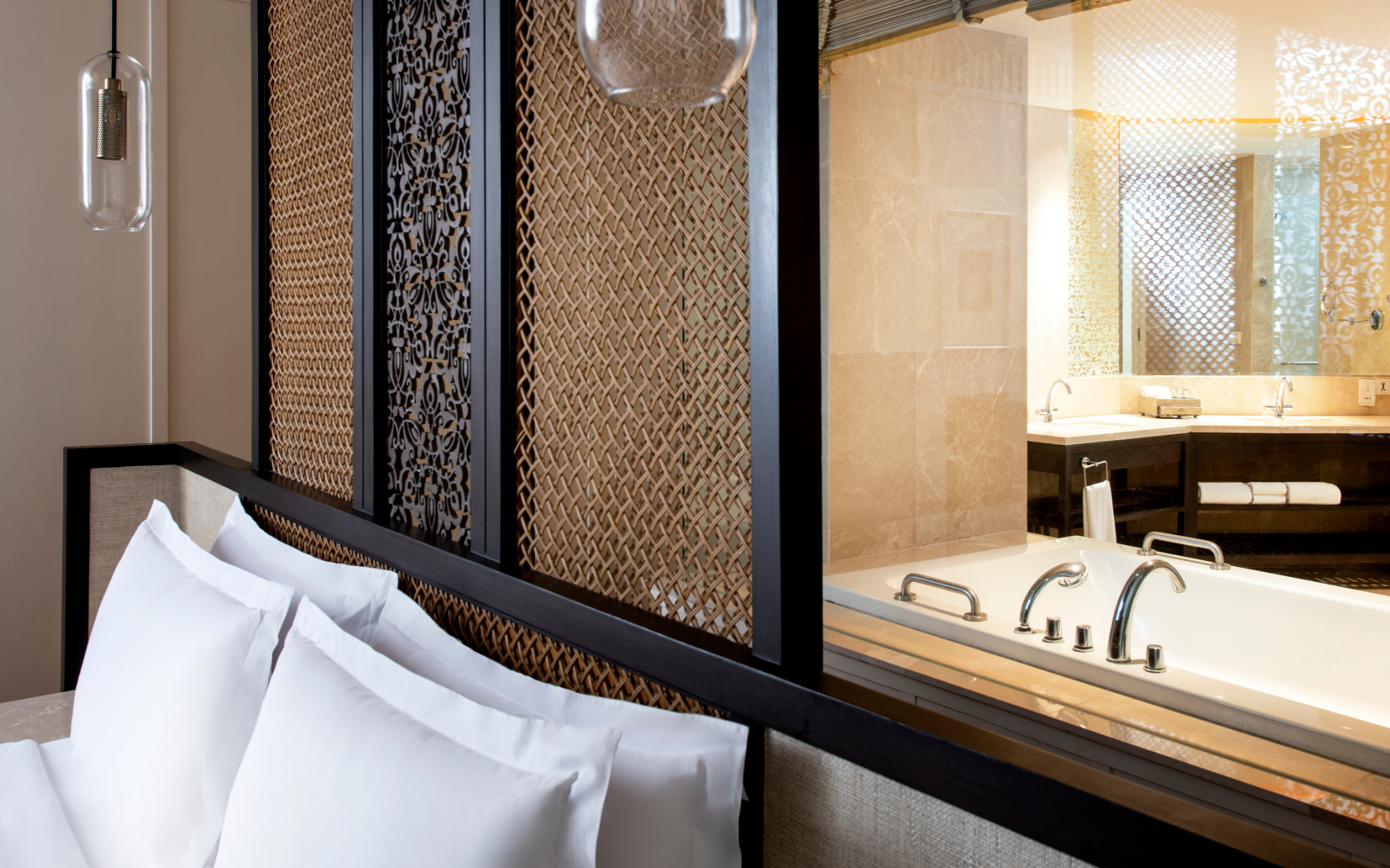 ห้องขนาด 55 ตร.ม. ฝั่งบีช วิง พร้อมระเบียงขนาดใหญ่ และห้องน้ำหินอ่อนพร้อมสิ่งอำนวยความสะดวกระดับพรีเมียม